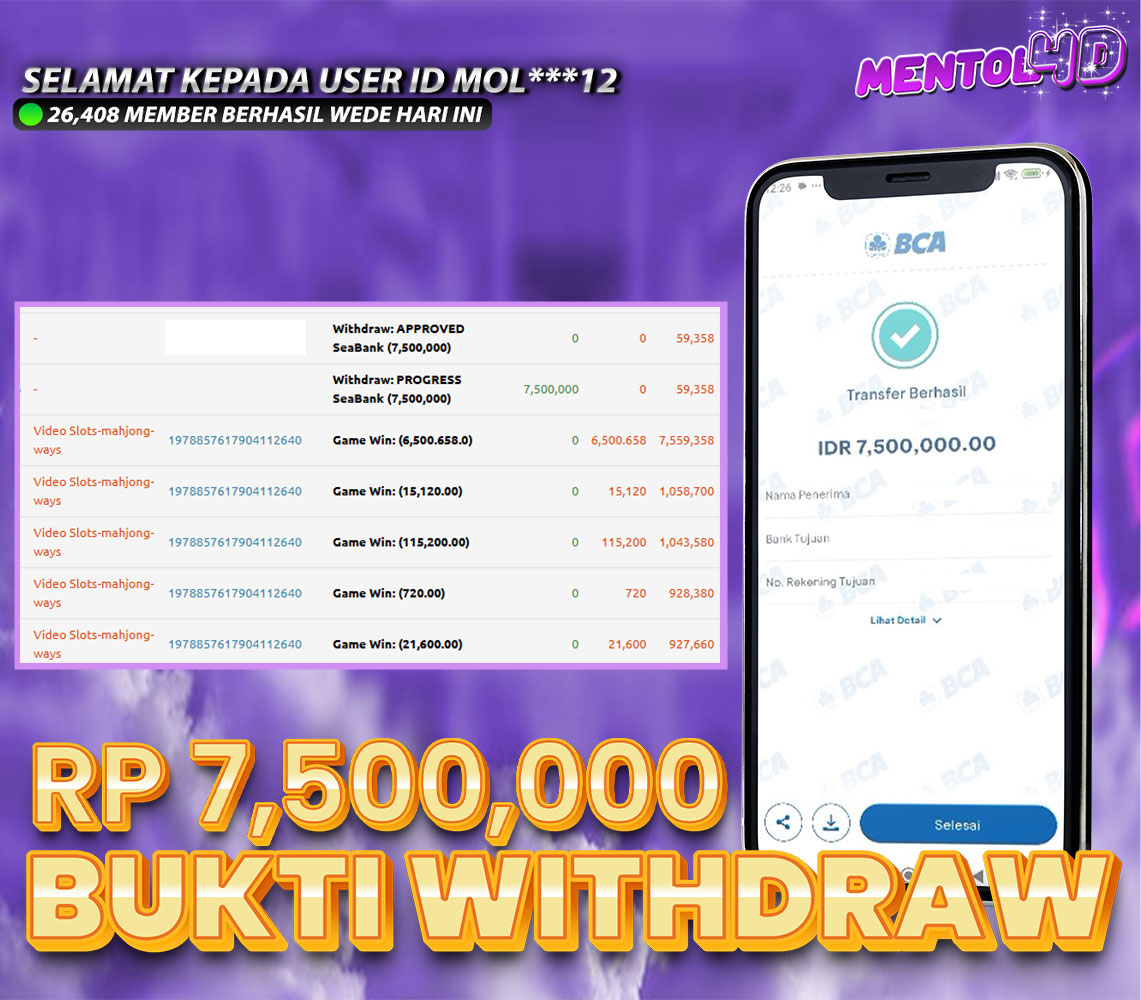 Selamat kepada User id : MOL***12 Telah berhasil mendapat kemenangan pada “ PGSOFT” Sebesar Rp.7,500,000.,-