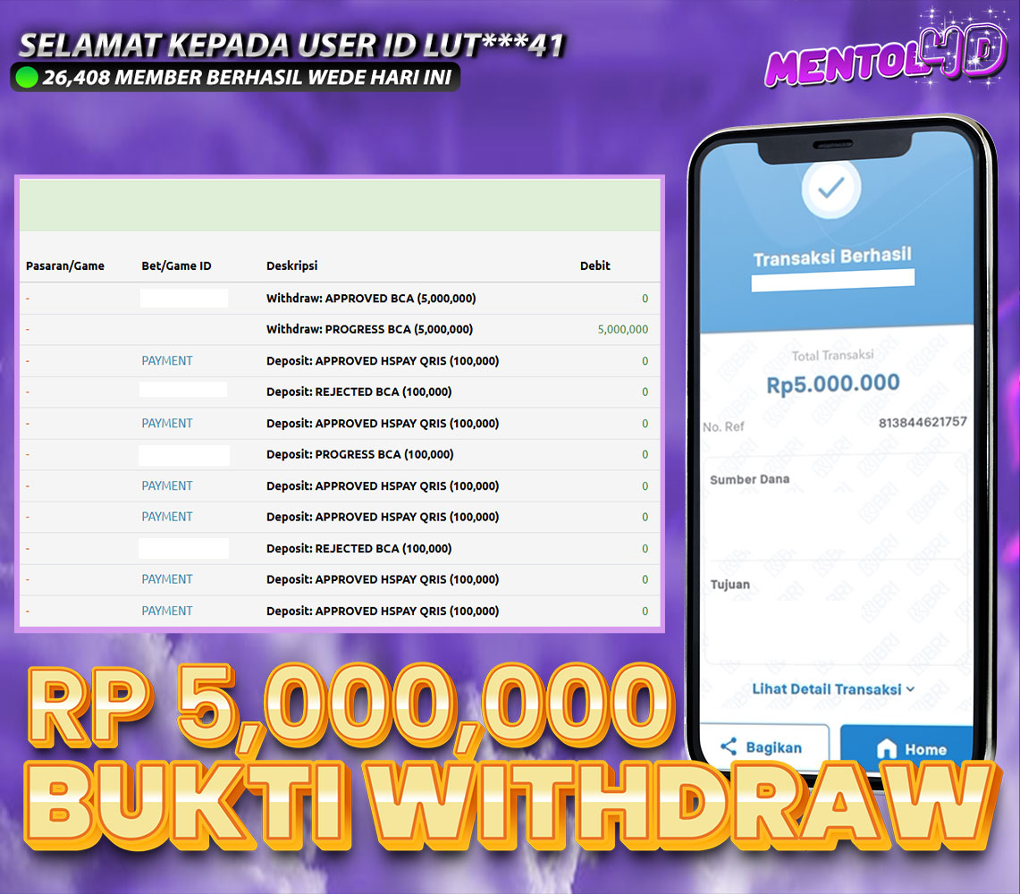 Ayo segera daftarkan diri kalian pada Situs kami di MENTOL4D, dengan minimal deposit Rp.20.000.- & minimal withdraw Rp.50.000.-