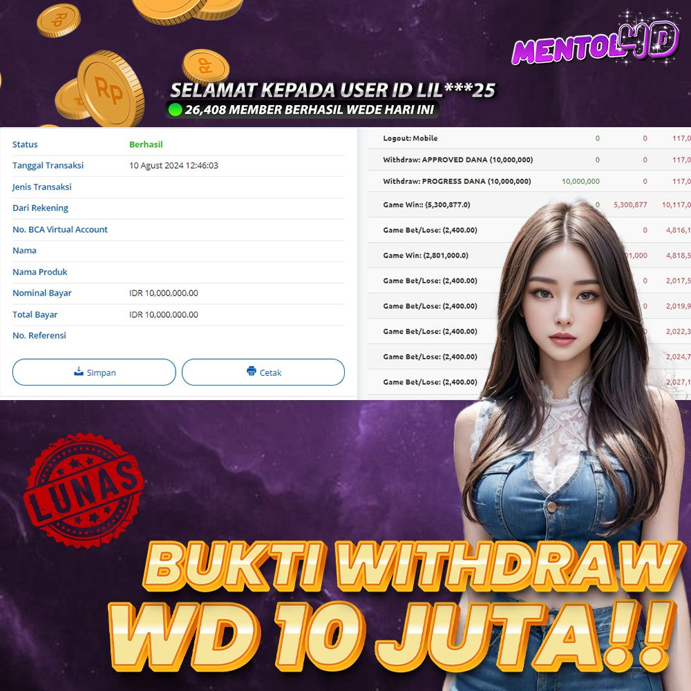 Masih ragu dengan MENTOL4D ? Silahkan lihat bukti kemenangan Member Setia kami, pada Situs MENTOL4d kemenangan berapapun akan dibayarkan kepada kalian semua. MENTOL4D adalah Situs Judi Online Terpercaya Indonesia dan memiliki Jutaan member aktif tiap bulan nya. Ayo raih kemenangan puluhan sampai ratusan juta bersama di situs MENTOL4D.