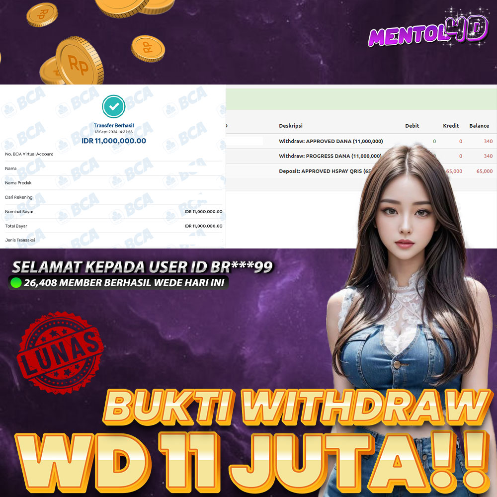 Masih ragu dengan MENTOL4D ? Silahkan lihat bukti kemenangan Member Setia kami, pada Situs MENTOL4d kemenangan berapapun akan dibayarkan kepada kalian semua. MENTOL4D adalah Situs Judi Online Terpercaya Indonesia dan memiliki Jutaan member aktif tiap bulan nya. Ayo raih kemenangan puluhan sampai ratusan juta bersama di situs MENTOL4D.