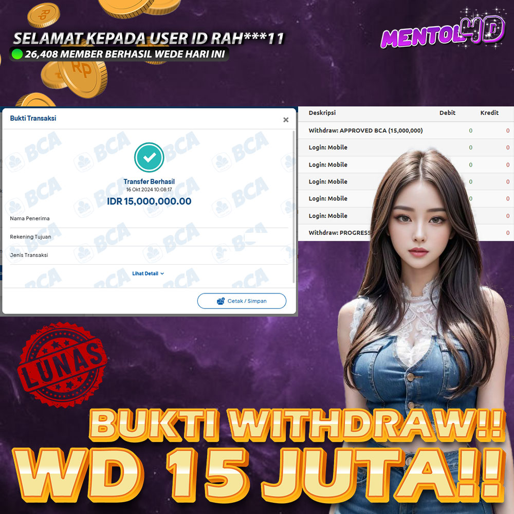 Masih ragu dengan MENTOL4D ? Silahkan lihat bukti kemenangan Member Setia kami, pada Situs MENTOL4d kemenangan berapapun akan dibayarkan kepada kalian semua. MENTOL4D adalah Situs Judi Online Terpercaya Indonesia dan memiliki Jutaan member aktif tiap bulan nya. Ayo raih kemenangan puluhan sampai ratusan juta bersama di situs MENTOL4D.