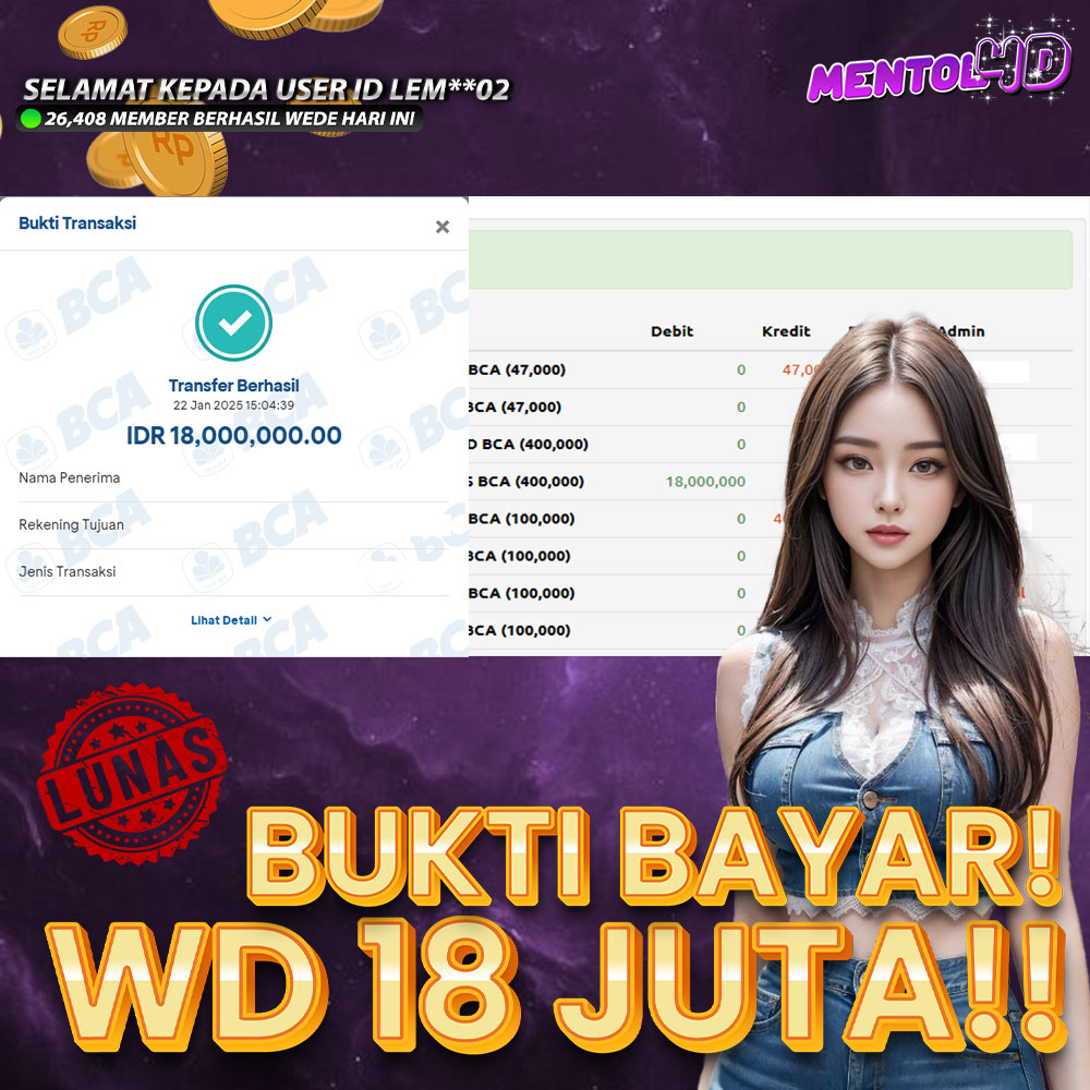 Masih ragu dengan MENTOL4D ? Silahkan lihat bukti kemenangan Member Setia kami, pada Situs MENTOL4d kemenangan berapapun akan dibayarkan kepada kalian semua. MENTOL4D adalah Situs Judi Online Terpercaya Indonesia dan memiliki Jutaan member aktif tiap bulan nya. Ayo raih kemenangan puluhan sampai ratusan juta bersama di situs MENTOL4D.
