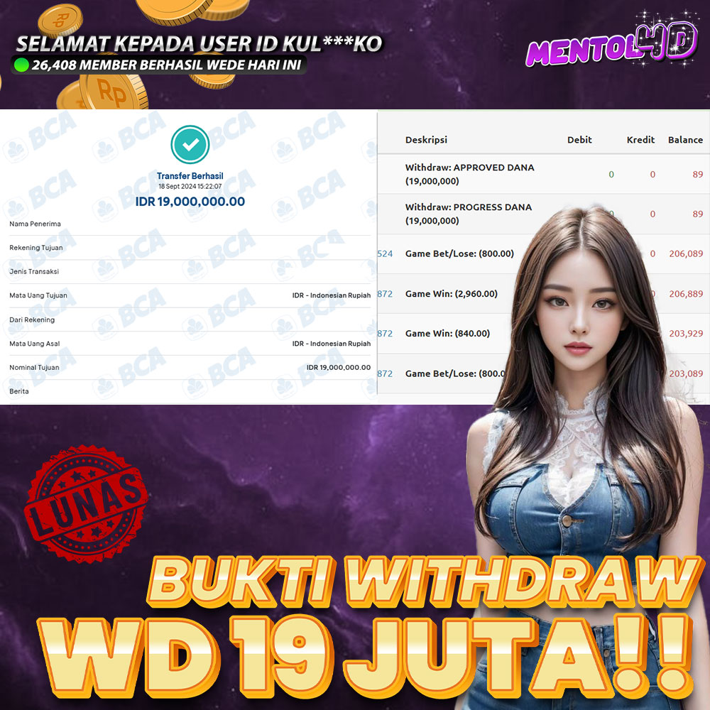 Masih ragu dengan MENTOL4D ? Silahkan lihat bukti kemenangan Member Setia kami, pada Situs MENTOL4d kemenangan berapapun akan dibayarkan kepada kalian semua. MENTOL4D adalah Situs Judi Online Terpercaya Indonesia dan memiliki Jutaan member aktif tiap bulan nya. Ayo raih kemenangan puluhan sampai ratusan juta bersama di situs MENTOL4D.