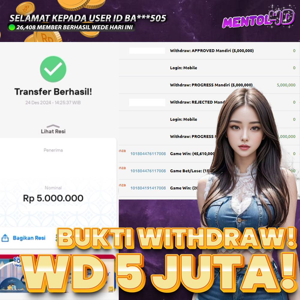 Masih ragu dengan MENTOL4D ? Silahkan lihat bukti kemenangan Member Setia kami, pada Situs MENTOL4d kemenangan berapapun akan dibayarkan kepada kalian semua. MENTOL4D adalah Situs Judi Online Terpercaya Indonesia dan memiliki Jutaan member aktif tiap bulan nya. Ayo raih kemenangan puluhan sampai ratusan juta bersama di situs MENTOL4D.