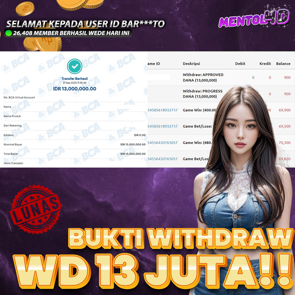 Selamat kepada User id : BAR***TO Telah berhasil mendapat kemenangan pada “ PERMAINAN PRAGMATIC ” Sebesar Rp.13,000,000.,-
