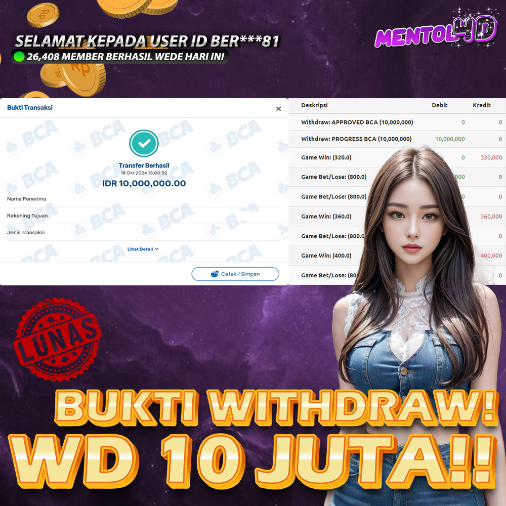 Masih ragu dengan MENTOL4D ? Silahkan lihat bukti kemenangan Member Setia kami, pada Situs MENTOL4d kemenangan berapapun akan dibayarkan kepada kalian semua. MENTOL4D adalah Situs Judi Online Terpercaya Indonesia dan memiliki Jutaan member aktif tiap bulan nya. Ayo raih kemenangan puluhan sampai ratusan juta bersama di situs MENTOL4D.