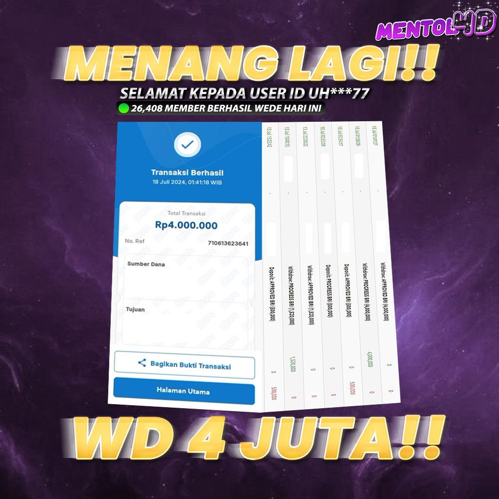 Masih ragu dengan MENTOL4D ? Silahkan lihat bukti kemenangan Member Setia kami, pada Situs MENTOL4d kemenangan berapapun akan dibayarkan kepada kalian semua. MENTOL4D adalah Situs Judi Online Terpercaya Indonesia dan memiliki Jutaan member aktif tiap bulan nya. Ayo raih kemenangan puluhan sampai ratusan juta bersama di situs MENTOL4D.
