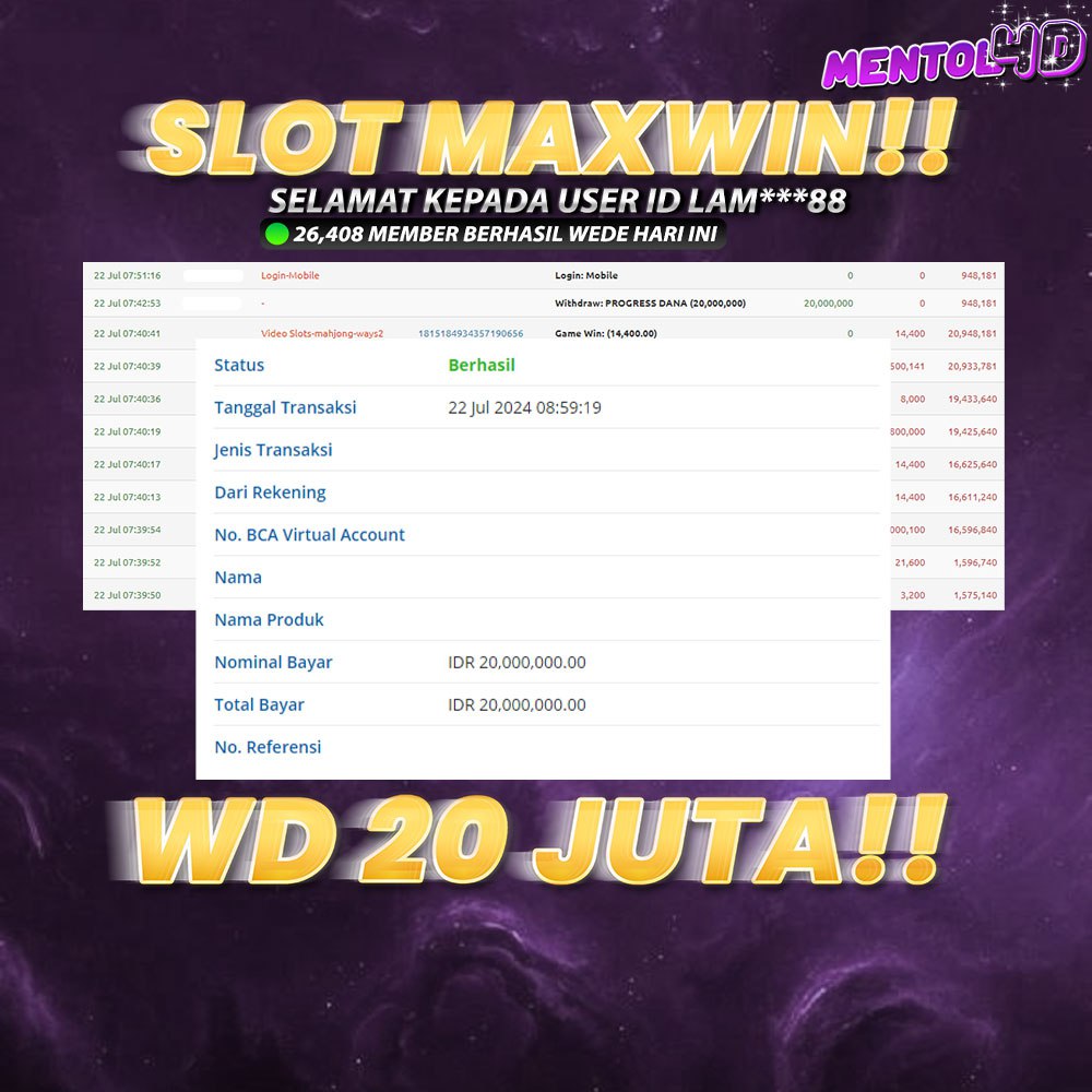 Ayo segera daftarkan diri kalian pada Situs kami di MENTOL4D, dengan minimal deposit Rp.20.000.- & minimal withdraw Rp.50.000.-